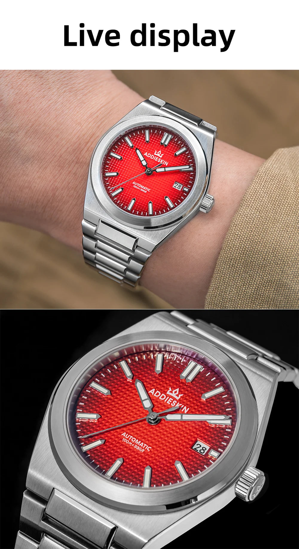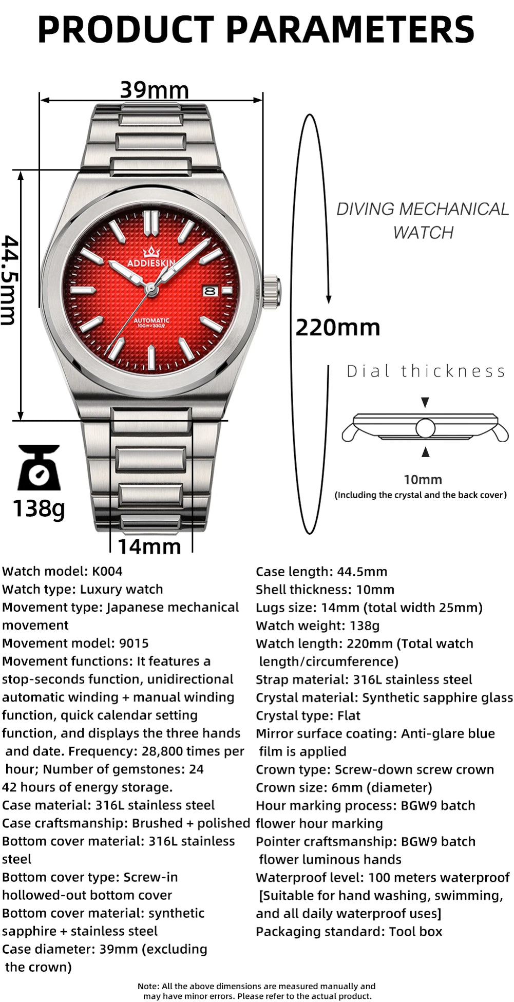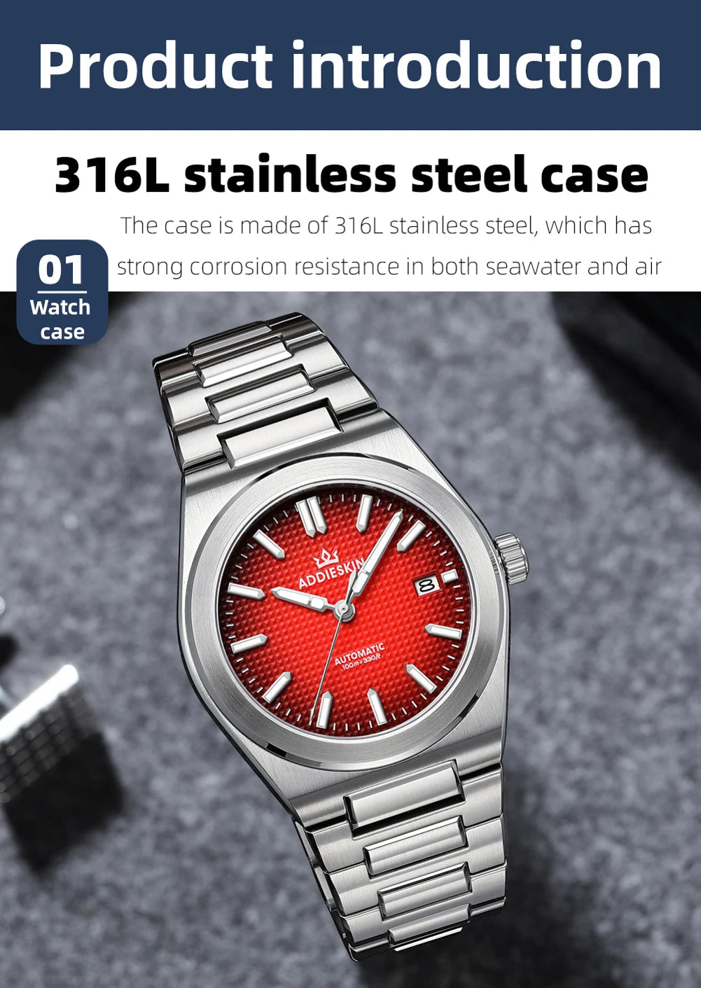 ADDIESKIN Automatic Men’s Mechanical Watch Japan 9015 Movement Sapphire Glass Luminous 316L Stainless Steel 100M Waterproof