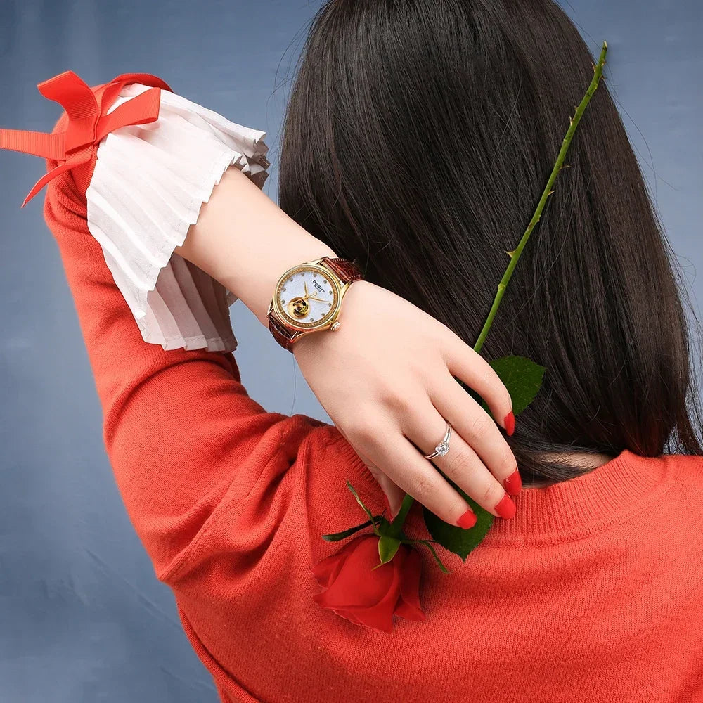 BERNY Luxury 18K Gold Mechanical Watch for Women Automatic Self-Wind Sapphire Ladies Wristwatch 72 Diamond 5ATM Skeleton Design