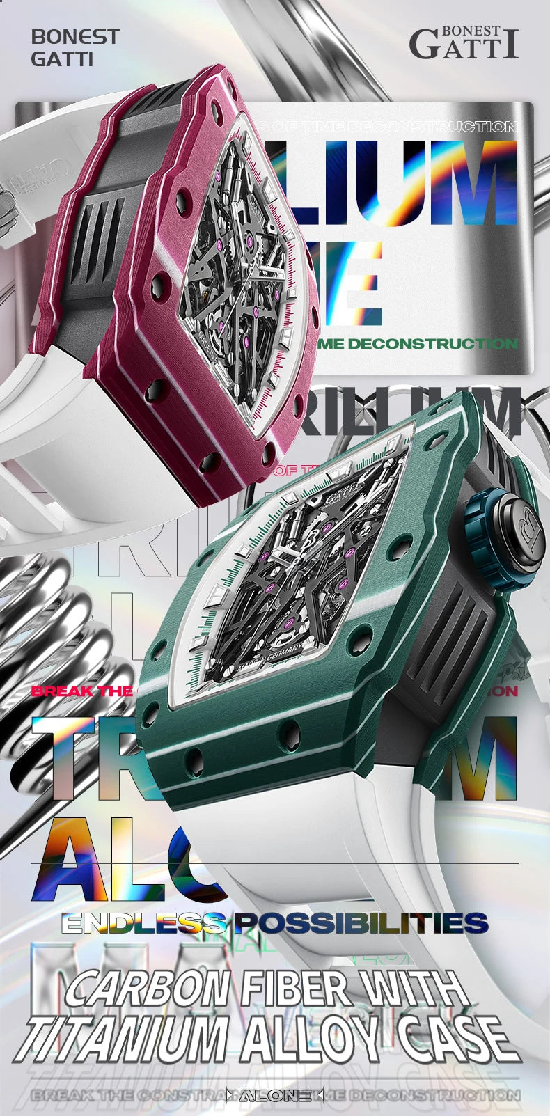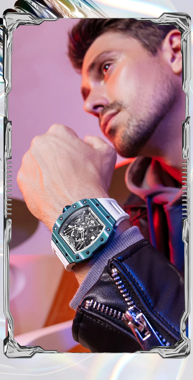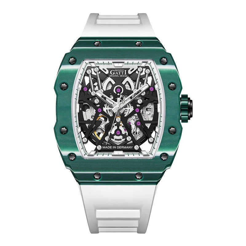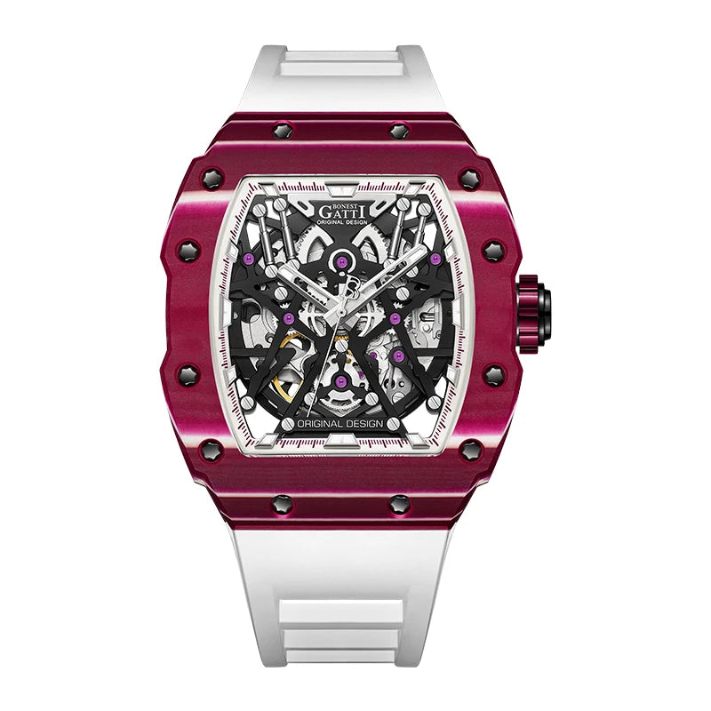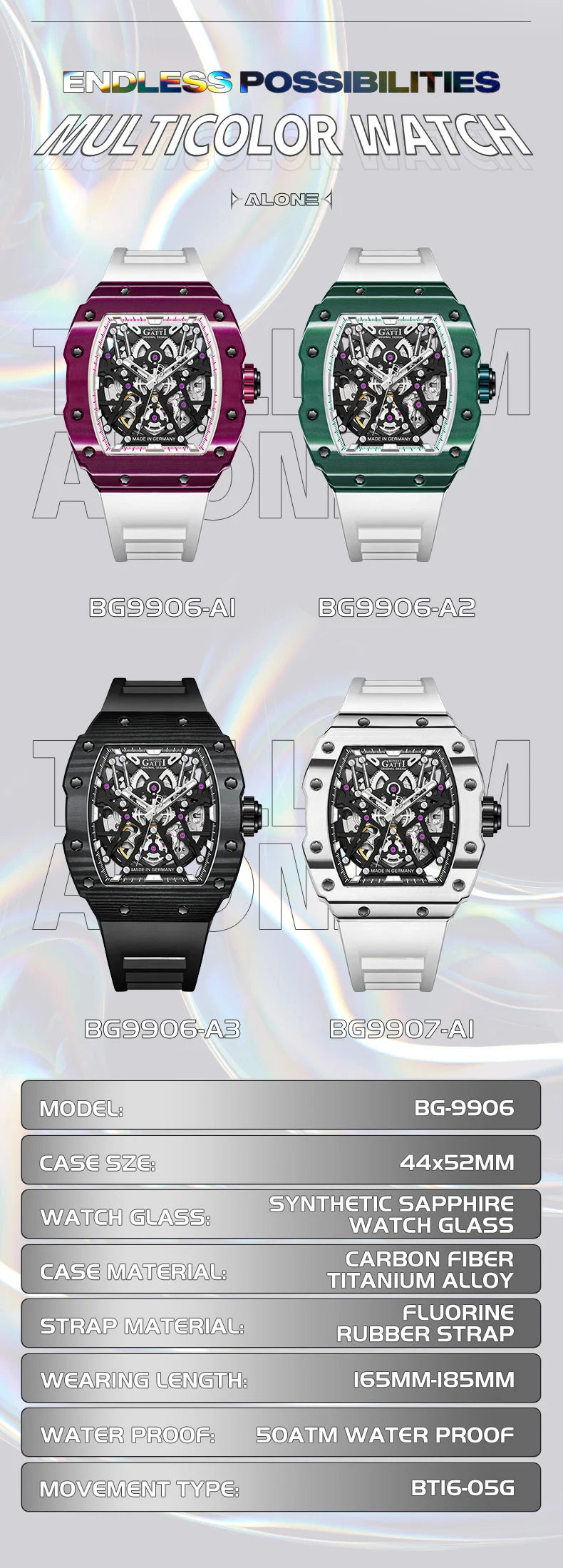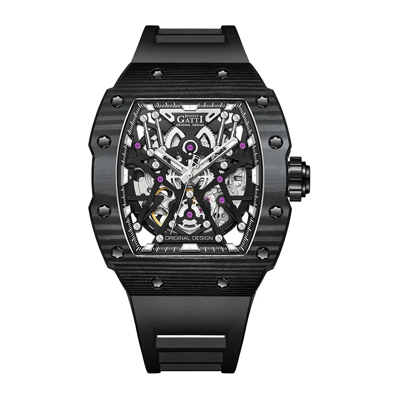 BONEST GATTI Brand 9906 Watch Carbon Fiber Men Fashion Light Luxury Through Hollow Dial Rubber Strap Automatic Mechanical Watch