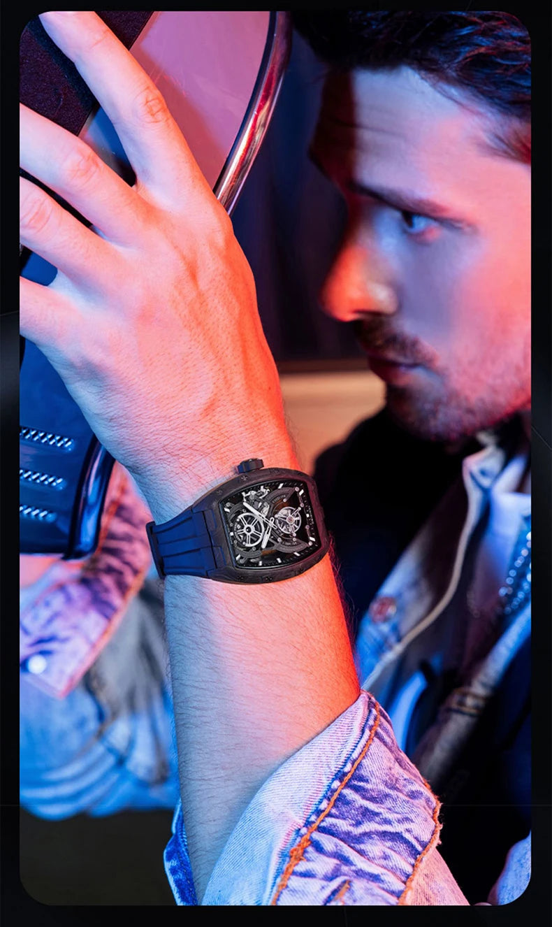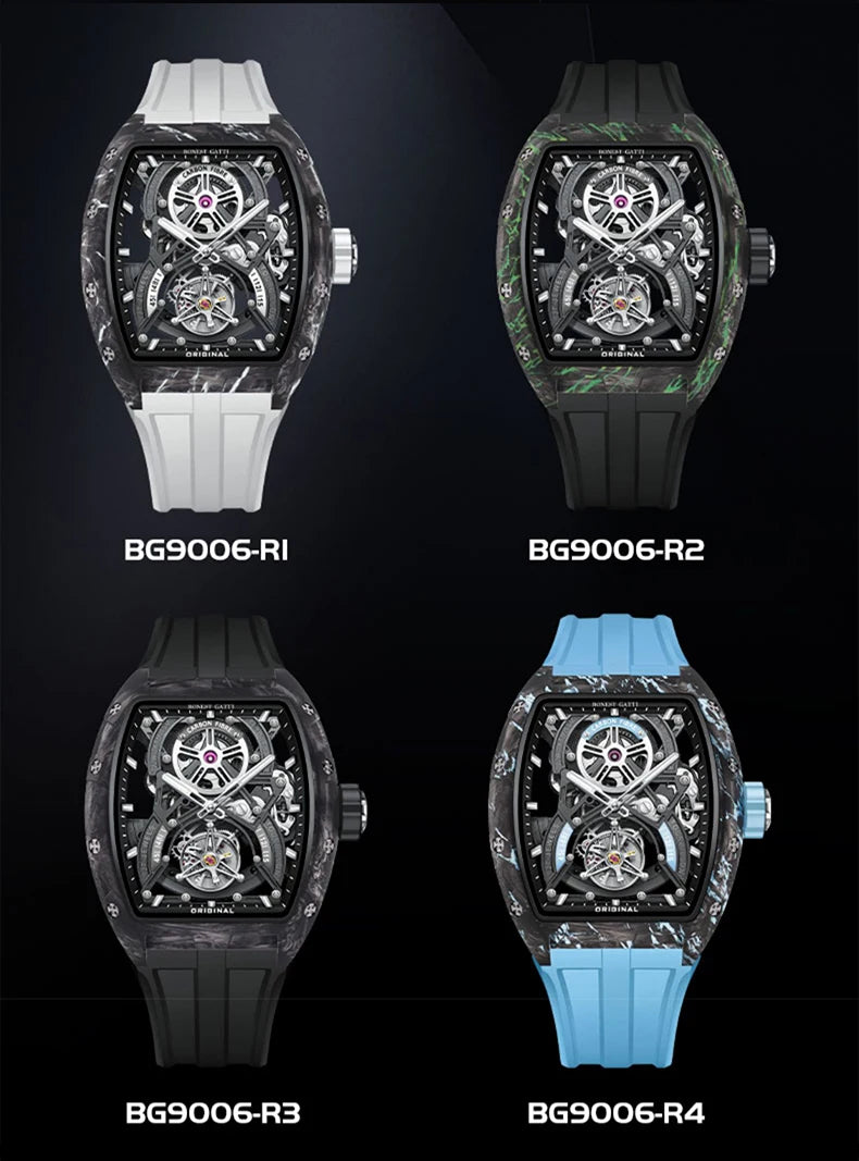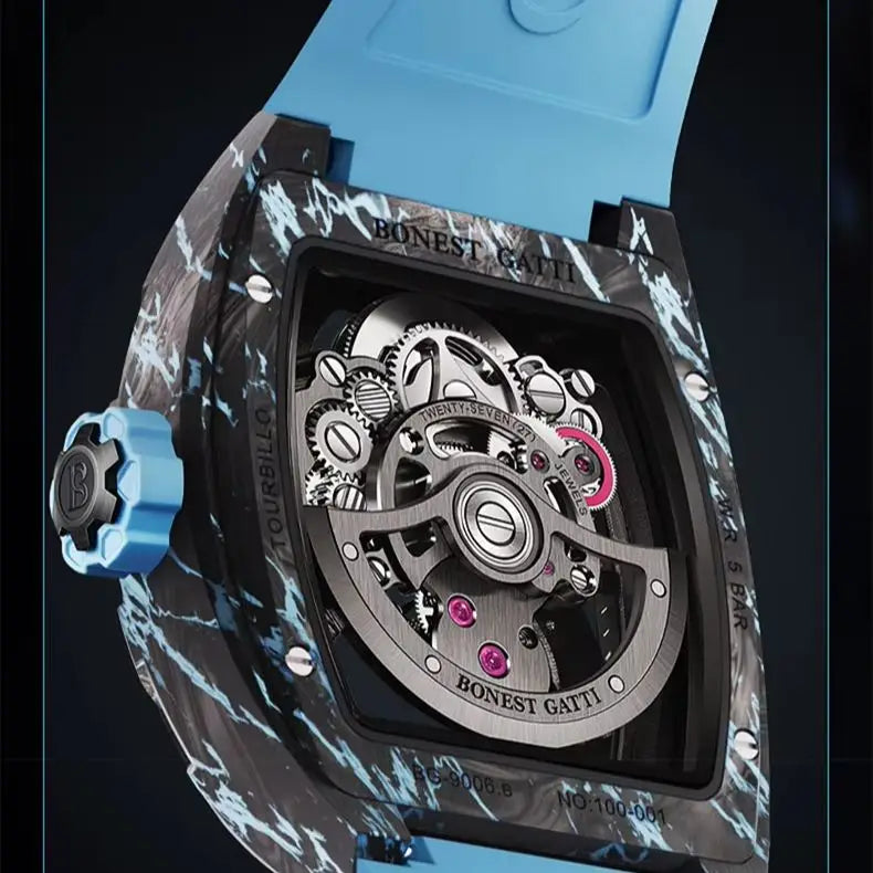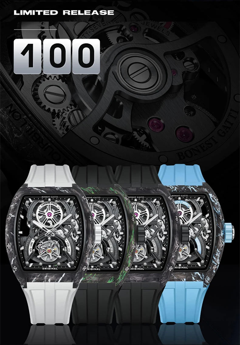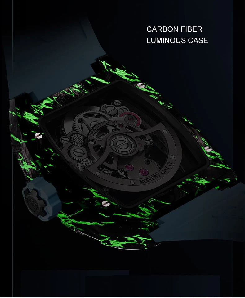 BONEST GATTI Men Tourbillon Watch 52mm Tonneau Automatic Mechanical Wristwatch Carbon Fiber Luminous Case Skeleton Dial Sapphire
