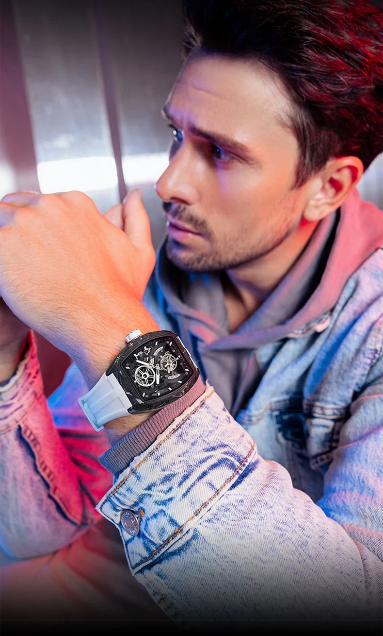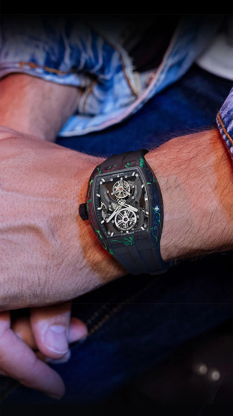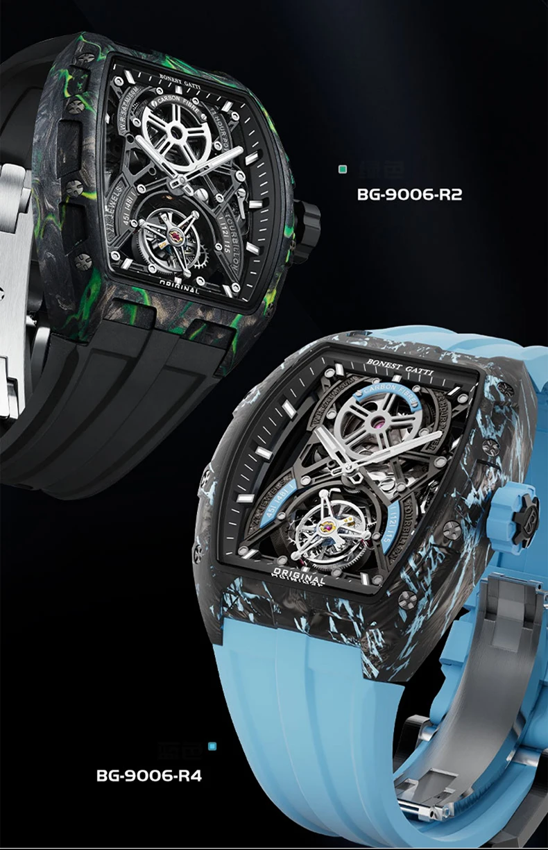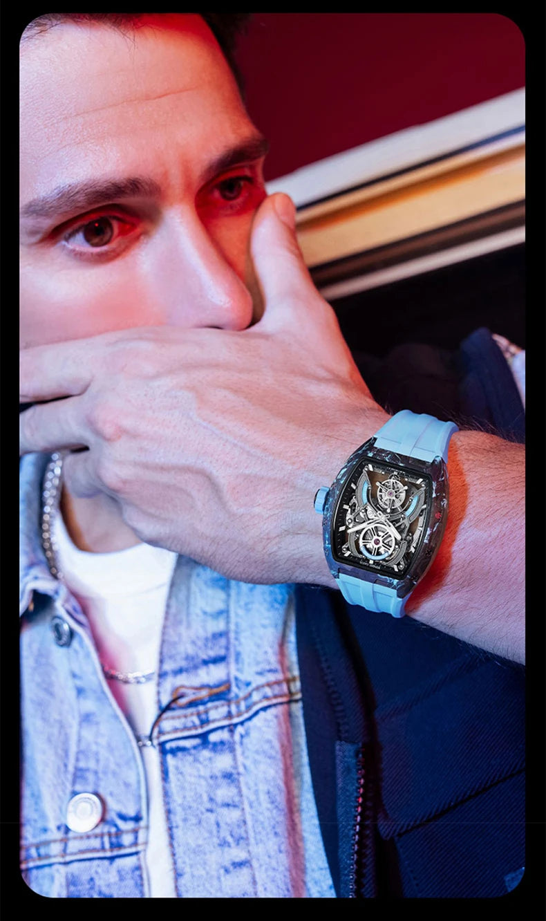 BONEST GATTI Men Tourbillon Watch 52mm Tonneau Automatic Mechanical Wristwatch Carbon Fiber Luminous Case Skeleton Dial Sapphire
